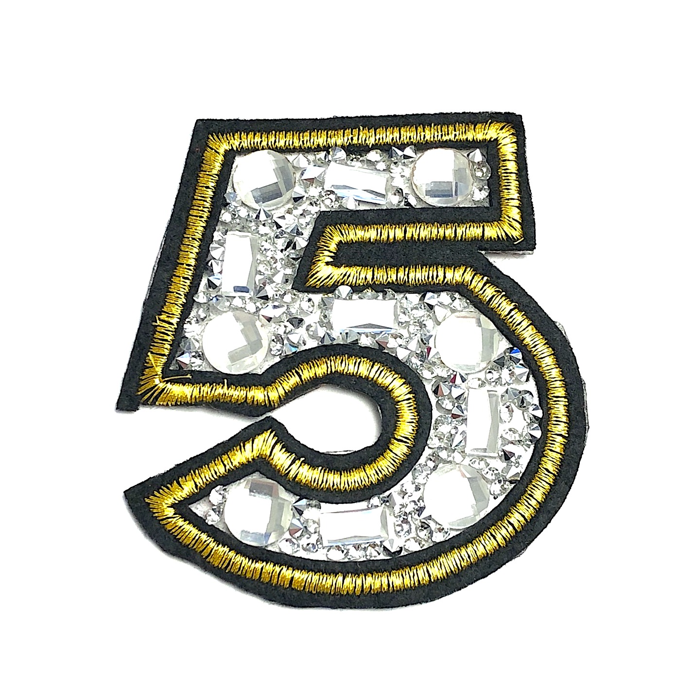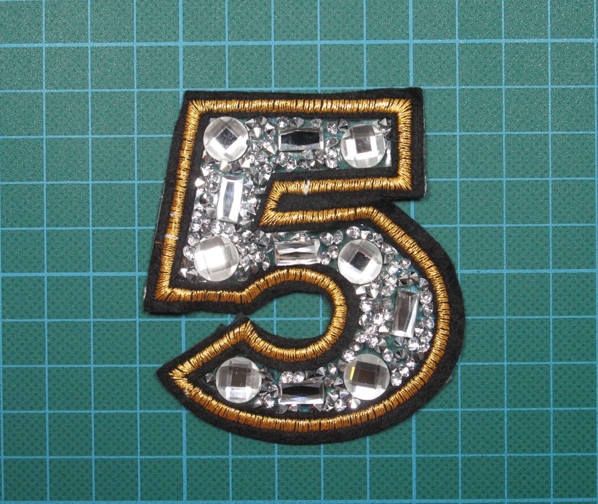 Emblema numero 5 base de Cola com pedras, e Rebordo Bordado em Lurex sobre Feltro.8cm x 7cm